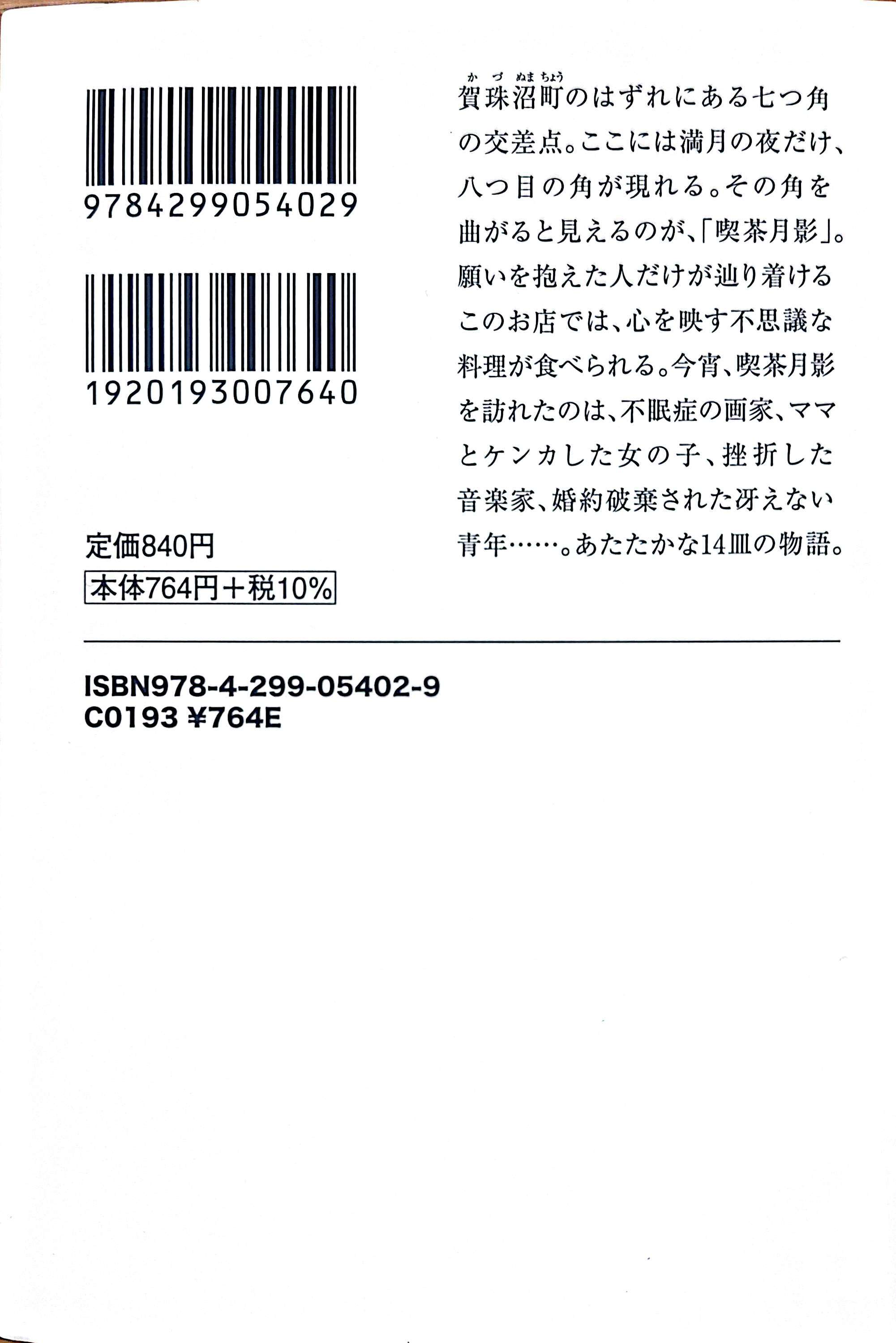 賀珠沼町のはずれにある七つ角の交差点。ここには満月の夜だけ、八つ目の角が現れる。その角を曲がると見えるのが、「喫茶月影」。願いを抱えた人だけが辿り着けるこのお店では、心を映す不思議な料理が食べられる。今宵、喫茶月影を訪れたのは、不眠症の画家、ママとケンカした女の子、挫折した音楽家、婚約破棄された冴えない青年…。あたたかな14皿の物語。第11回ネット小説大賞受賞作。